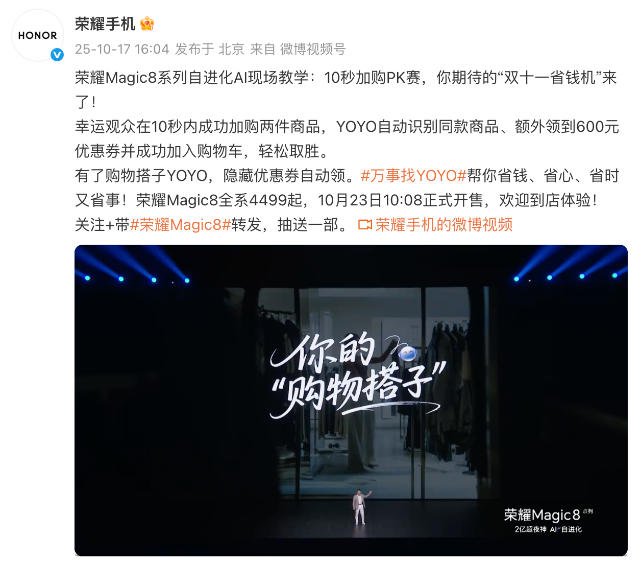 10 月 15 日,荣耀发布了首款自进化 AI 原生手机 —— 荣耀 Magic8 系列。发布会上曝光的 AI 自动领券购物功能共享财富,迅速引发了市场广泛关注。10 月 22 日,央视财经频道从 AI 赋能新消费的角度切入,报道了以荣耀 Magic8 的 YOYO 智能体为代表的 AI 技术,正如何激活消费新潜能、提升消费体验。