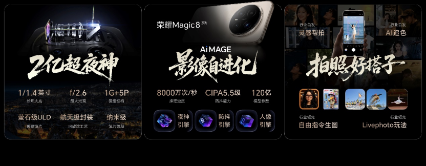 “巅峰 AI、巅峰夜神、巅峰性能”,荣耀 Magic8 系列以“自进化 AI”为脑、以“AiMAGE 影像”为眼、以最强性能硬件为体,构成了软硬件深度协同的完整生态。